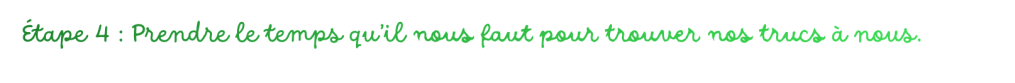 Une des astuces du livre est de prendre exemple sur une personne inspirante. Qu’est-ce que cette personne ferait dans cette situation? Je ne m’en étais pas rendue compte, mais c’est ce que je fais. Pour moi, c’est ma mère. Après m’avoir aidée à survivre au secondaire et au cégep, ma mère est maintenant rendue une experte dans l’art de savoir ce que Jadou a besoin. Je me pose donc la question : qu’est-ce que maman me dirait de faire? Quatre fois sur cinq, je réalise que je savais depuis le début ce que je devais faire, mais je refusais de l’admettre. Et dans l’autre cas? Je lui envoie un message ou je l’appelle en pleurant.