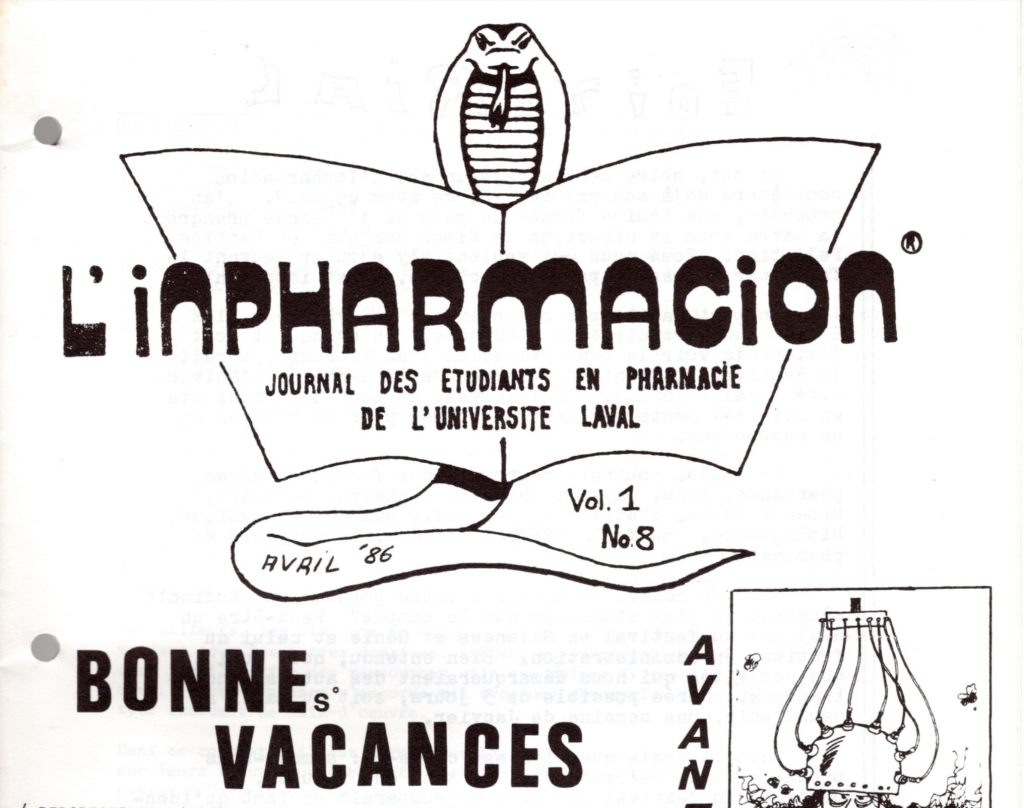 Depuis 1985 (à l’époque où les sessions d’été n’existaient pas…!), l’Impharmation (anciennement l’Inpharmacion) est le journal officiel des étudiant.e.s en pharmacie de l’Université Laval! Chaque année, le journal rassemble une équipe de rédacteurs chevronnés qui s’affairent à pondre les meilleurs articles pour vous informer et, surtout, vous divertir!