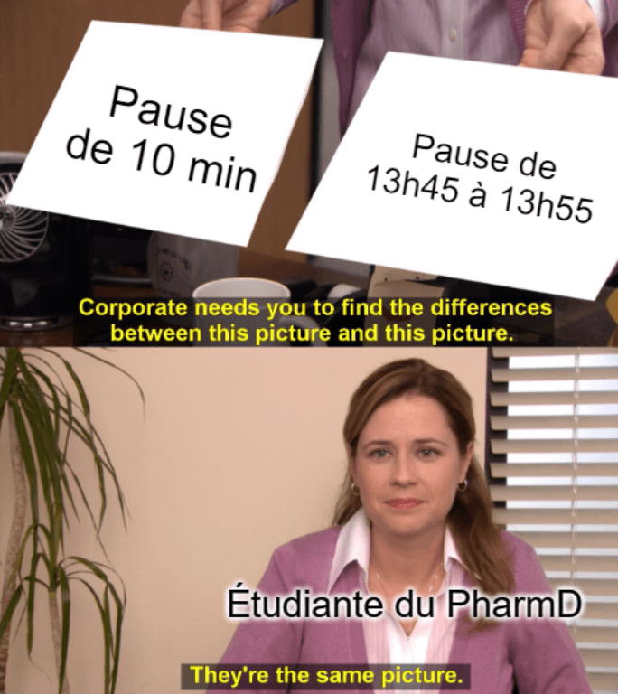 Saviez-vous que les étudiants et étudiantes du Pharm.D. se distinguent par leur capacité à élaborer des mèmes de qualité irréprochable? Oui oui, notre talent se mesure à bien plus que de retenir une myriade de noms de médicaments! 😉